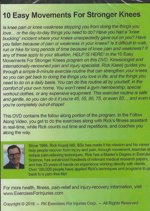 In the 10 Easy Movements For Stronger Knees program on this DVD, Kinesiologist and internationally-renowned pain and injury specialist, Rick Kaselj guides you through a simple 8-minute exercise routine that can strengthen your knees, so you can get back to doing the things you love in life, and the things you need to do on a daily basis. You can do this routine all by yourself, in the comfort of your own home. You won't need a gym membership, special workout clothes, or any expensive equipment. This exercise routine is safe and gentle, so you can do it if you're 45, 55, 65, 75, or even 85... and even if you're completely out-of-shape!