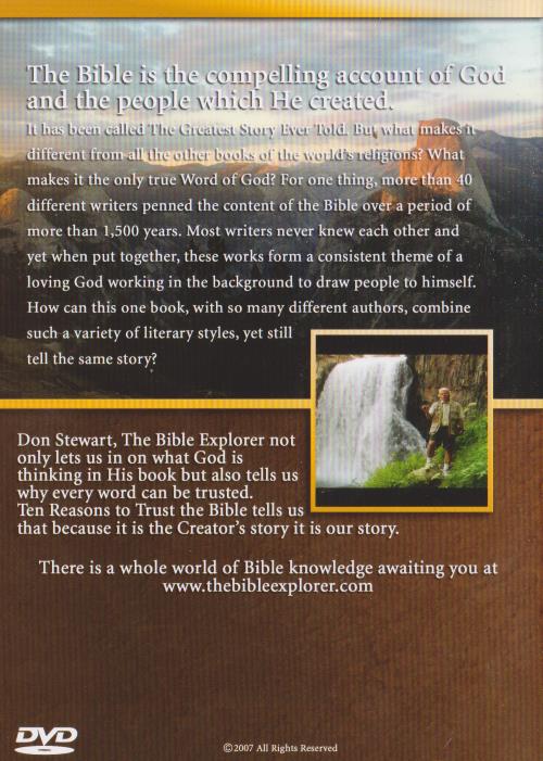 10 Reasons To Trust The BibleThe Bible. What makes it the only true Word of God? For one thing, more than 40 different writers penned the content of the Bible over a period of more than 1,500 years. Most writers never knew each other and yet when put together, these works form a consistent theme of a loving God working in the background to draw people to himself. How can this one book, with so many different authors, combine such a variety of literary styles, yet still tell the same story? Don Stewart, The Bible Explorer not only lets us in on what God is thinking in His book but also tells us why every word can be trusted. Ten Reasons to Trust the Bible tells us that because it is the Creator's story it is our story.