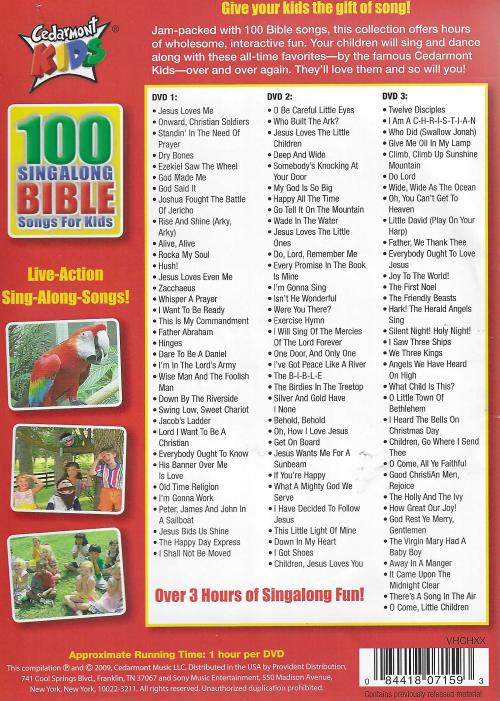 High Value, Low Price! Perhaps the greatest collection of childrens music ever assembled on DVD and CD! 100 all-time favorite children's Bible songs, performed by the Cedarmont Kids and packaged together on 3 long-play DVDs or 3 full-length CDs. Songs include: Jesus Loves Me, This Little Light of Mine, Jesus Loves the Little Children, Father Abraham, Joy to the World and 95 more! Perfect for Gift Giving! Kids and parents will love this special package of Cedarmont Kids videos and audio. Jam-packed with the best-loved Children's Bible Songs, this collection offers hours of wholesome interactive fun! DVD 3-Pack Features: 100 Classic Bible Songs for kids 3 DVDs, each approximately 1 hour long Lyrics included as Subtitles