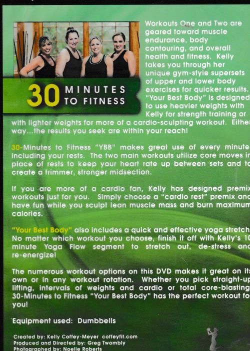The 30 Minutes to Fitness ''Your Best Body'' DVD with Kelly Coffey-Meyer includes two 30-minute workouts and more. Workouts one and two are geared toward muscle endurance, body contouring, and overall health and fitness. Kelly takes you through her unique gym-style supersets of upper and lower body exercises for quicker results. ''Your Best Body'' is designed to use heavier weights with Kelly for strength training or with lighter weights for more of a cardio-sculpting workout. Either way...the results you seek are within your reach! 30 Minutes to Fitness ''YBB'' makes great use of every minute, including your rests.
