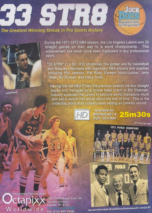 "33 STR8" (1 x 60', HD) chronicles this golden era for basketball and features interviews with legendary NBA players and coaches including Phil Jackson, Pat Riley, Kareem Abdul-Jabbar, Jerry West, Bill Russell, and many more.
