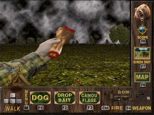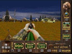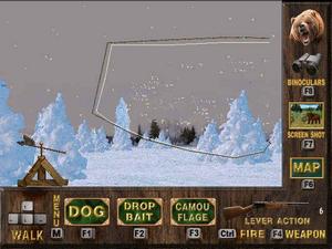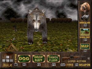 In 3D Hunting: Grizzly you track grizzly bears from a first-person perspective through interactive 3D landscapes in a virtual world filled with realistic environmental touches such as streams, hills, valleys and different types of foliage so there's no threat of a large bear tearing a chunk from your buttocks. In order to successfully hunt and kill a grizzly bear, you need to master various tools, such as bait types, binoculars, scopes, and camouflage outfits that match the terra firma, as well as traps and weapons. There are four weapons to choose (including bolt and lever action rifles) that become progressively harder to use, although more effective. And don't forget your faithful hunting dog.