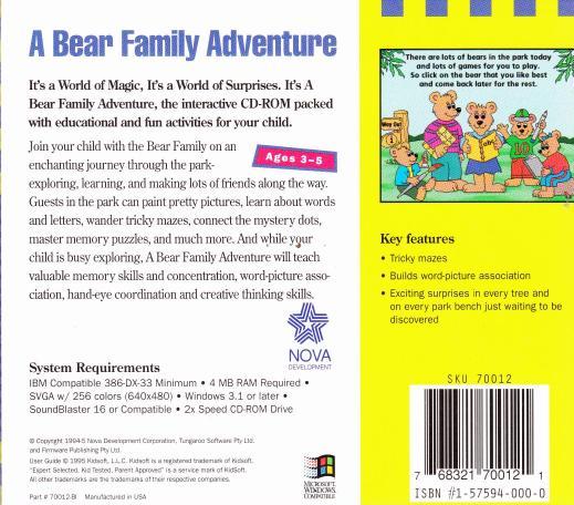 It's a World of Magic, It's a World of Surprises. It's A Bear Family Adventure, the interactive CD-ROM packed with educational and fun activities for your child. Join your child with the Bear Family on an enchanting journey through the park-exploring, learning, and making lots of friends along the way. Guests in the park can paint pretty pictures, learn about words and letters, wander tricky mazes, connect the mystery dots, master memory puzzles, and much more. And while nur child is busy exploring, A Bear Family Adventure will teach valuable memory skills and concentration, word-picture asso-ciation, hand-eye coordination and creative thinking skills.