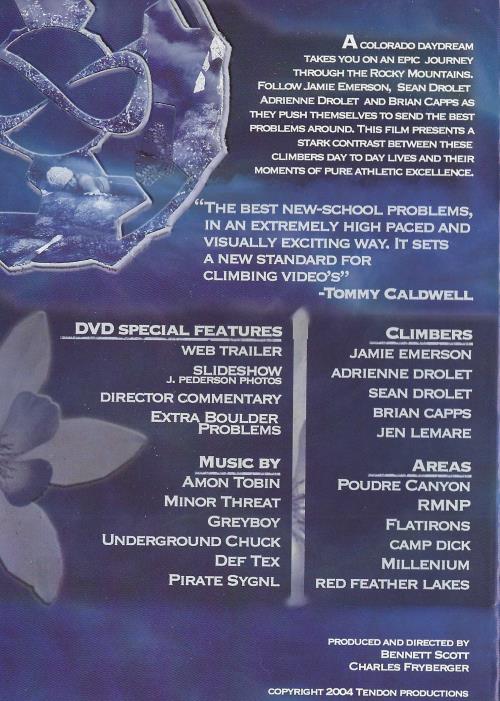A COLORADO DAYDREAM TAKES YOU ON AN EPIC JOURNEY THROUGH THE ROCKY MOUNTAINS. FOLLOW JAMIE EMERSON, SEAN DROLET ADRIENNE DROLET AND BRIAN CAPPS AS THEY PUSH THEMSELVES TO SEND THE BEST PROBLEMS AROUND. THIS FILM PRESENTS A STARK CONTRAST BETWEEN THESE CLIMBERS DAY TO DAY LIVES AND THEIR MOMENTS OF PURE ATHLETIC EXCELLENCE. THE BEST NEW-SCHOOL PROBLEMS, IN AN EXTREMELY HIGH PACED AND VISUALLY EXCITING WAY. IT SETS A NEW STANDARD FOR CLIMBING VIDEO'S" -TOMMY CALDWELL DVD SPECIAL FEATURES WEB TRAILER SLIDESHOW J. PEDERSON PHOTOS DIRECTOR COMMENTARY EXTRA BOULDER PROBLEMS MUSIC BY AMON TOBIN MINOR THREAT GREYBOY UNDERGROUND CHUCK DEF TEX PIRATE SYGNL CLIMBERS JAMIE EMERSON ADRIENNE DROLET SEAN DROLET BRIAN CAPPS JEN LEMARE AREAS POUDRE CANYON RMNP FLATIRONS CAMP DICK MILLENIUM RED FEATHER LAKES PRODUCED AND DIRECTED BY BENNETT SCOTT CHARLES FRYB ERG ER