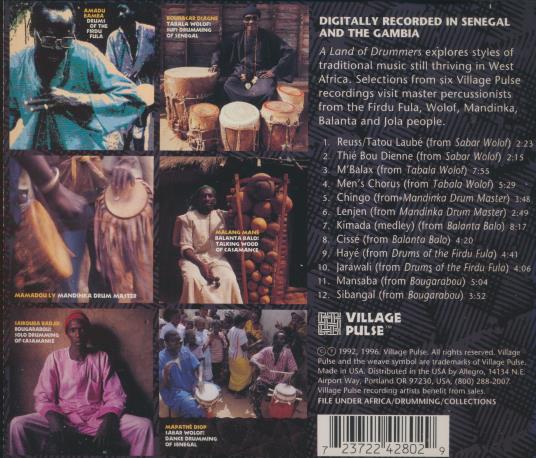A Land of Drummers collects traditional percussion performances recorded in Senegal and The Gambia and presented by Village Pulse. The compilation highlights master drummers and community ensemble traditions of the Firdu Fula, Wolof, Mandinka, Balanta and Jola peoples. Rhythms range from solo drum showcases to medleys and chorus-accompanied pieces, emphasizing complex hand-drumming techniques and regional styles. These recordings present raw, authentic village percussion and dance music captured on location.