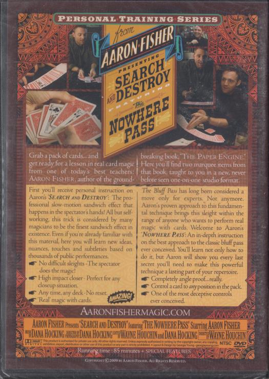 Aaron Fisher presents two of his hallmark card routines in an intimate, one-on-one studio setting, drawn from his influential work The Paper Engine. This release offers clear, thorough instruction on the professional slow-motion sandwich technique known as Search and Destroy and the classic deceptive move called The Nowhere Pass.