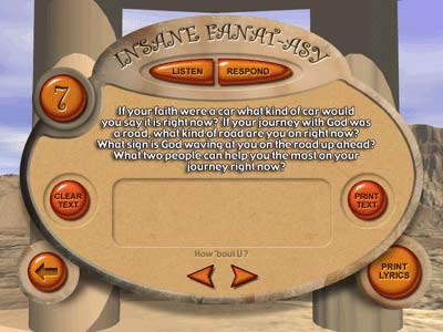 As the CD begins, your students sweep in over the Arabian Desert to the tune of "I Heard a Voice Today" --following Abraham and Sarah on their way to the land of Canaan. Students then come circling into "The Scriptorium" somewhere in the hills of Canaan. A large Scripture Console rises up in front of them. It is through the Scriptorium's Console that they will be able to launch themselves into five distinct learning areas and four additional learning areas.