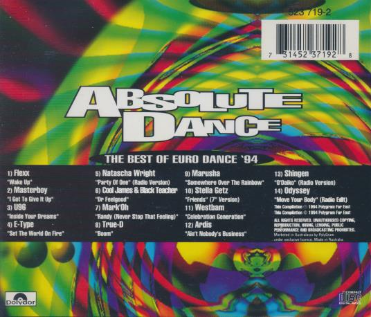 Absolute Dance is a various artists compilation gathering hit Eurodance tracks from the early 1990s. The collection showcases upbeat, synth-driven club anthems and poppy dancefloor numbers. It highlights both established and underground European dance acts that shaped the sound of the era. This volume focuses on 1994 releases and radio-friendly edits of popular dance singles.
