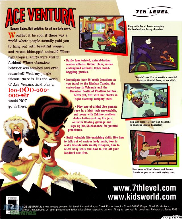 "Ace Ventura" is based on the Jim Carrey movie with the same title. You play an animal-detective, who helps animals in trouble. The game resembles "Leisure Suit Larry" in the way it treats adult material: there's no explicit nudity or pornographic scenes, but the dialogues, the jokes, the actions and the thoughts of the animal-loving hero go certainly in this direction. Travel from Alaska via the magic land Vulcania to Bavaria in this comic adventure, that also contains some action elements.