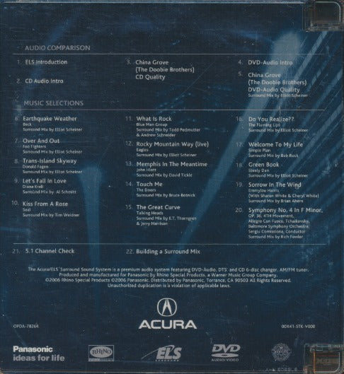 This DVD-Audio disc serves as a comprehensive audio comparison with DVD quality and DVD-Audio quality tracks. It includes music selections from a variety of artists mixed in surround sound by notable engineers. The disc also features system checks and technology overviews related to the Acura TL's ELS Surround system.