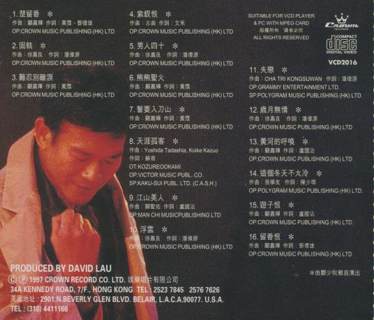 Produced by David Lau. © P 1997 Crown Record Co. Ltd. Suitable for VCD player & PC with MPEG card. All rights reserved.