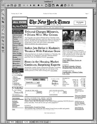 Adobe has revamped Acrobat's interface by adding several new buttons to the tool bar and then splitting it up so one half occupies the left vertical while the other fills the top horizontal. One questionable interface change in Acrobat 4.0 is the new "Show/Hide Navigation Pane" button in place of the three previous buttons for bookmarks, thumbnails, and document-only views. When clicking the Show/Hide button, a tabbed pane appears on the left-hand side with options for the three previously mentioned views. This change isn't really bad, and is actually pretty intuitive once you get used to it, but Adobe has opted to place all the menu commands for each of these views in a tiny window accessed by an even tinier triangle next to each tab. Since many of these commands like "Create All ThumbNails" and "Add Bookmark" were previously accessible via obvious pull-down menus, relocating them to this obscure little triangle can be quite confusing for any seasoned Acrobat user. Fortunately, keyboard commands for these commonly-accessed tasks still work.