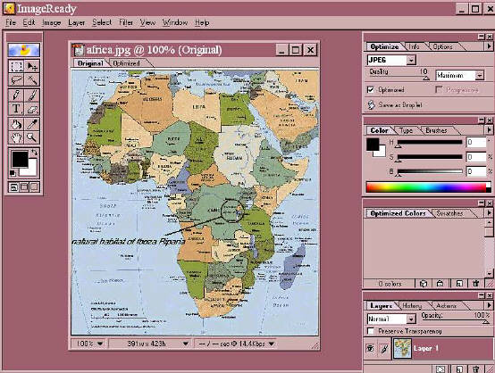 The main purpose of Adobe ImageReady is to compress images for use on the web. Adobe ImageReady allows the user to output the images to the standard web formats, GIF and JPEG. However, unlike most other compression programs, it also supports PNG 8 bit and PNG 24 bit graphics. PNG is an emerging image format, which is starting to become common on the web. Compression for each image time is slightly different. JPEGs have an overall image quality rating, but GIFs are optimized by reducing the number of colors used. Through the "Optimization" Palette, You can easily experiment with these settings and view them live on the screen. For JPEG compress, it allows you to use set an image quality rating of "Maximum", "High", "Medium", or "Low". Additionally, you can use a sliding bar to select a rating on a scale from 1 to 100 to further optimize.