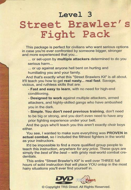 Level 3 Street Brawler's Fight Pack This package is perfect for civilians who want serious options in case you're ever confronted by someone bigger, stronger and more experienced that you... ... or set-upon by multiple attackers determined to do you serious harm... ... or up against anyone hell bent on hurting and humiliating you and your family. And that's exactly what this "Street Brawlers Kit" is all about. It'll teach you how to get real nasty... real fast. Savage, vicious, and ruthless skills that are: - Fast and easy to learn, with no need for high-end conditioning. - Designed to work against multiple attackers, armed attackers, and highly-skilled gangs who have ambushed you in the dark. - Simple.