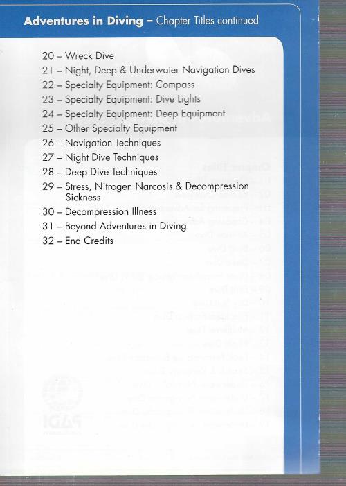Chapter Titles 01 — Opening Titles 02 — Course Overview 03 — Preparing for Adventure Dives 04 — Choosing Adventure Dives 05 — Altitude Dive 06 — Boat Dive 07 — Deep Dive 08 — Diver Propulsion Vehicle (DPV) Dive 09 — Drift Dive 10 — Dry Suit Dive 11 — Fish Identification Dive 12 — Multilevel Dive 13 — Night Dive 14 — Peak Performance Buoyancy Dive 15 — Search & Recovery Dive 16 — Underwater Naturalist Dive 17 — Underwater Navigation Dive 18 — Underwater Photography Dive 19 — Underwater Videography Dive Adventures in Diving — Chapter Titles continued 20 — Wreck Dive 21 — Night, Deep & Underwater Navigation Dives 22 — Specialty Equipment: Compass 23 — Specialty Equipment: Dive Lights 24 — Specialty Equipment: Deep Equipment 25 — Other Specialty Equipment 26 — Navigation Techniques 27 — Night Dive Techniques 28 — Deep Dive Techniques 29 — Stress, Nitrogen Narcosis & Decompression Sickness 30 — Decompression Illness 31 — Beyond Adventures in Diving 32 — End Credits •