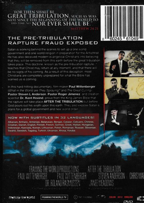 Satan is working behind the scenes to set up a one world government and one world religion in preparation for the Antichrist. He has also deceived modern evangelical Christians into believing that they will be removed from this earth before the great tribulation takes place. This doctrine, known as the pre-tribulation rapture, teaches that Christ may return at any moment, and that there will be no signs of his coming. As a result of this deception, most Christians are completely unprepared for what the Bible has warned us is coming. In this hard-hitting documentary, film-maker Paul Wittenberger (What in the World are They Spraying? and The Great Culling), Pastor Steven L Anderson, Pastor Roger Jimenez, and creation scientist Kent Hovind, prove from the King James Bible that the rapture will take place AFTER THE TRIBULATION but before God pours out his wrath upon this earth. They also expose Satan's plans for a global government and new world order. DVD now contains subtitles in 32 languages: Albanian, Amharic, Armenian, Belarusian, Bengali, Catalan, Cebuano, Chinese, Croatian, Danish, English, Finnish, French, German, Greek, Haitian, Hungarian, Indonesian, Kannada, Korean, Lithuanian, Polish, Romanian, Russian, Slovenian, Swahili, Swedish, Tagalog, Turkish, Ukrainian, Xhosa, Yoruba