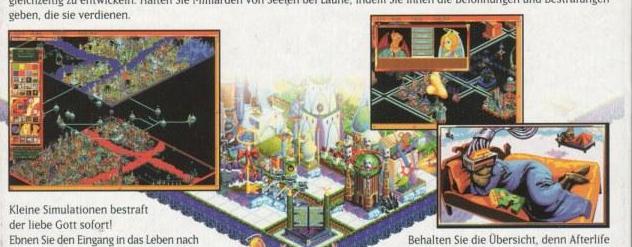 As the regional spiritual director (Demiurge), your task in Afterlife is to provide a world in which the recently deceased can "live" until their final resting place, heaven or hell, is decided. The game, written in a humorous vein, is a non-linear world-building simulation. Creation of the Afterlife world involves developing real estate on two planes simultaneously. The game features more than 200 "rewards and punishments" to be given to your population and close to 300 detailed and specific building tiles used during the creation process.