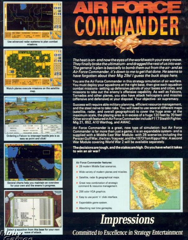 Air Force Commander is a sophisticated simulation of strategic air combat command. Complete with this game is the first Combat Module--consisting of over twenty scenarios set in the Middle East in the modern day. A second Combat Module featuring more scenarios from World War II (in particular the Battle of Britain) is available direct from Impressions.