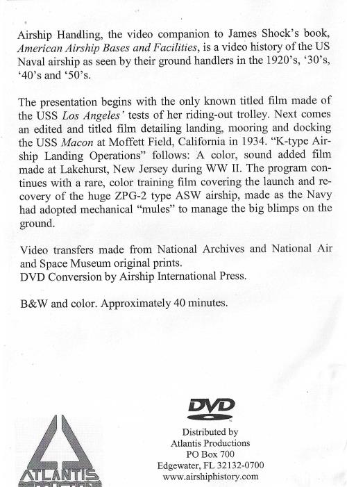 Airship Handling, the video companion to James Shock's book, American Airship Bases and Facilities, is a video history of the US Naval airship as seen by their ground handlers in the 1920's, '30's, `40's and '50's. The presentation begins with the only known titled film made of the USS Los Angeles' tests of her riding-out trolley. Next comes an edited and titled film detailing landing, mooring and docking the USS Macon at Moffett Field, California in 1934. "K-type Air-ship Landing Operations" follows: A color, sound added film made at Lakehurst, New Jersey during WW II. The program con-tinues with a rare, color training film covering the launch and re-covery of the huge ZPG-2 type ASW airship, made as the Navy had adopted mechanical "mules" to manage the big blimps on the ground. Video transfers made from National Archives and National Air and Space Museum original prints. DVD Conversion by Airship International Press. B&W and color. Approximately 40 minutes.