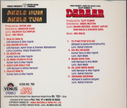This release is a compilation soundtrack featuring songs composed by Anu Malik for the films Akele Hum Akele Tum and DARAAR. The collection showcases leading playback singers of the 1990s including Udit Narayan, Alka Yagnik, Kumar Sanu, Abhijeet and Sadhana Sargam. The music ranges from romantic ballads and duets to lively film numbers, reflecting mainstream Bollywood production values. Issued by Venus, the album captures the melodic orchestration and pop influences common in 1990s Hindi film music.