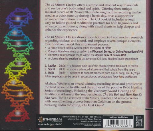 Akshara Weave is an award-winning recording artist and producer working in the field of sound healing and meditation music. The 10 Minute Chakra offers compact guided musical pieces designed to nourish and revive one's body, mind and spirit, with selections at 10, 20 and 30 minutes. The work draws on both ancient and modern research, employing a rarely heard tuning system called the Spiral of Fifths and compositional elements based on the Fibonacci series. Akshara Weave is a certified Reiki Master Teacher and has collaborated with sound healing pioneers to create immersive audio for meditation and therapeutic practice.