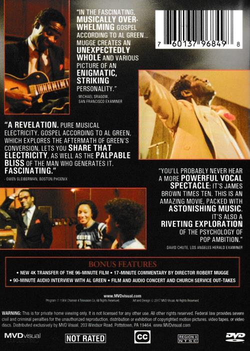 Following a 1974 personal tragedy that left him badly scarred and culminated in the suicide of a girlfriend, soul singing superstar Al Green turned his passions to worshipping the Lord and serving as an ordained minister at his own church in Memphis, Tennessee. Roof-raising gospel performances from Green and interviews fuel this spirit-lifting documentary from Robert Mugge. Songs include "Let's Stay Together," "Free at Last," "People Get Ready," "Straighten Out Your Life," and "Hallelujah (I Just Want to Praise the Lord)." 94 min. Widescreen; Soundtrack: English Dolby stereo; audio interview; theatrical trailer.
