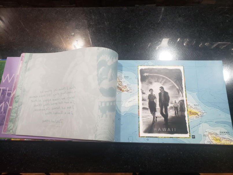 The hardcover edition measures a substantial 43.5cm by 28cm, making it a visually impressive collector’s item. With over 60 pages of rich content, it not only highlights celebrity photographs and promotional materials but also includes sketches from the creative team, which provide context to key scenes. Interestingly, the book reveals that the film was originally titled "Hawaii", hinting at early thematic directions and potential narrative focuses that may have shifted during production. This art book is perfect for those interested in film design, marketing, and the intricate process of bringing a cinematic world to life, offering an immersive experience that goes beyond the final screen version of Aloha.