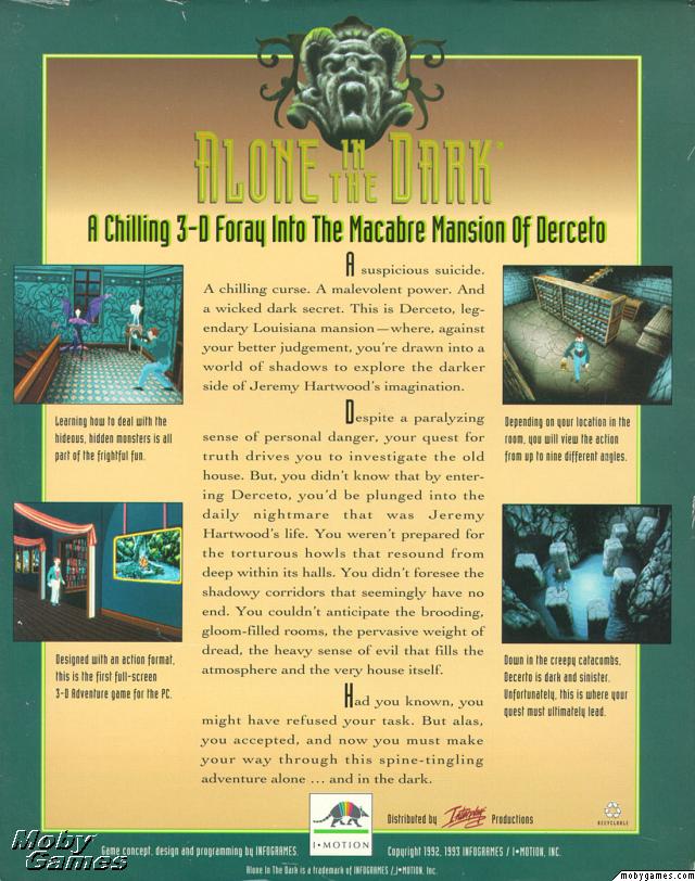 Jeremy Hartwood has committed suicide in his Louisiana mansion. You take the role of either Edward Carnby, a private investigator, or Emily Hartwood, Jeremy's niece, and investigate the suspicious death. The three-floor mansion is reputed to be haunted by its eccentric past owner. Very quickly, you realise that it is. Warped rats, zombies and giant worms are among the foes who are after you, and you must somehow escape.