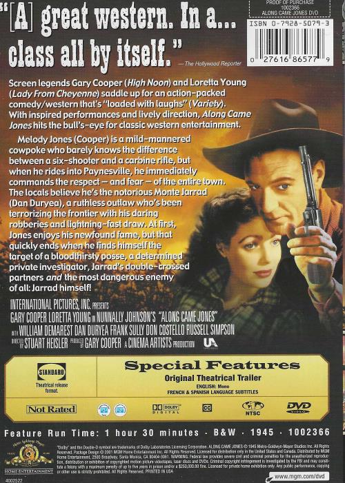 Screen legends Gary Cooper (High Noon) and Loretta Young (Lady From Cheyenne) saddle up for an action-packed comedy-western that's "loaded with laughs" (Variety). With inspired performances and lively direction, Along Came Jones hits the bull's-eye for classic western entertainment. Melody Jones (Cooper) is a mild-mannered cowpoke who barely knows the difference between a six-shooter and a carbine rifle, but when he rides into Paynesville, he immediately commands the respect - and fear - of the entire town. The locals believe he's the notorious Monte Jarrad (Dan Duryea), a ruthless outlaw who's been terrorizing the frontier with his daring robberies and lightning-fast draw. At first, Jones enjoys his newfound fame, but that quickly ends when he finds himself the target of a bloodthirsty posse, a determined private investigator, Jarrad's double-crossed partners and the most dangerous enemy of all: Jarrad himself!