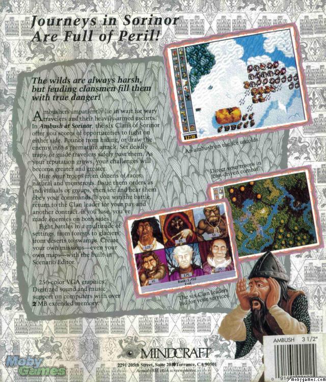 Ambush at Sorinor is a strategy game. Six clans are at war with each other in the land of Sorinor. Each group is hiring mercenaries to kill opposing VIPs and protect the own ones. You are taking on the role of a mercenary commander, placing your soldiers on the map and leading them throughout the battle. Since your funds are limited, you sometimes cannot hire all the people you need. The cast consists of humans as well as fantasy characters like orcs, dwarves and goblins. Battles take place in real time. A scenario editor is included.