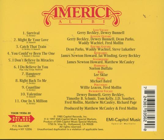America: Alibi MUSIC AUDIO CD 90s soft pop rock band! 1997 One Way Records OOP