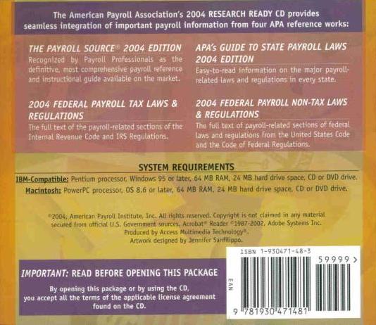 American Payroll Association's Research Ready CD 2004 PC business accounting law