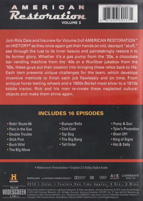 Join Rick Dale and his crew for Volume 3 of AMERICAN RESTORATION on HISTORY as they once again get their hands on old, decrepit "stuff," see through the rust to its inner beauty and painstakingly restore it to its former glory. Whether it's a gas pump from the '20s, a chocolate bar vending machine from the '40s or a Wurlitzer jukebox from the '50s, these guys put their passion into bringing these relics back to life. Each item presents unique challenges for the team, which develops inventive methods to finish each job flawlessly and on time. From antique horse betting wheels and a 1900s Berkel meat slicer to a 1970s kiddie tractor, Rick and his men re-create these neglected cultural objects and make them shine again.