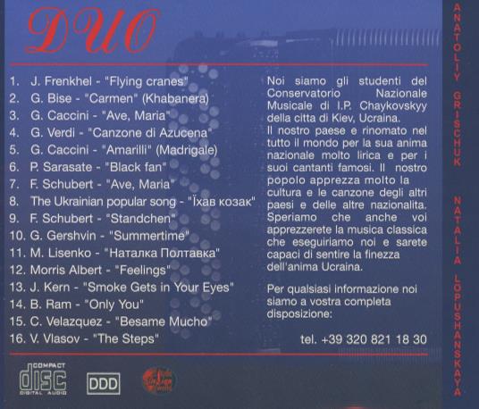 Duo features Anatoliy Grischuk and Natalia Lopushanskaya performing classical accordion music, including works by Schubert, Sarasate, Gershwin, and others. The album presents an eclectic selection of classical and popular works, performed with finesse and highlighting the vibrant tradition of accordion music in the classical genre.