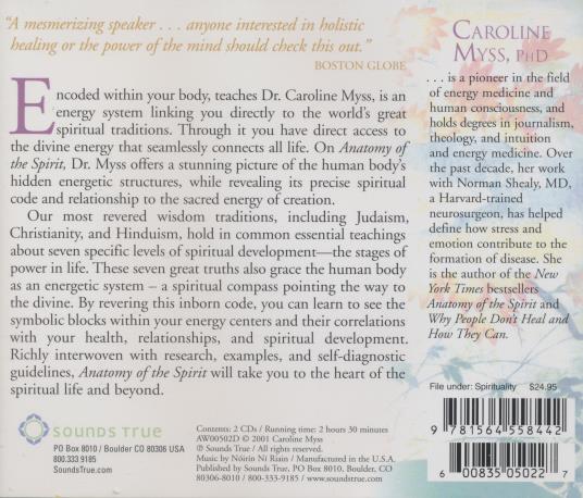 Encoded within your body, teaches Dr. Caroline Myss, is an energy system linking you directly to the world's great spiritual traditions. Through it you have direct access to the divine energy that seamlessly connects all life. On Anatomy of the Spirit, Dr. Myss offers a stunning picture of the human body's hidden energetic structures, while revealing its precise spiritual code and relationship to the sacred energy of creation.