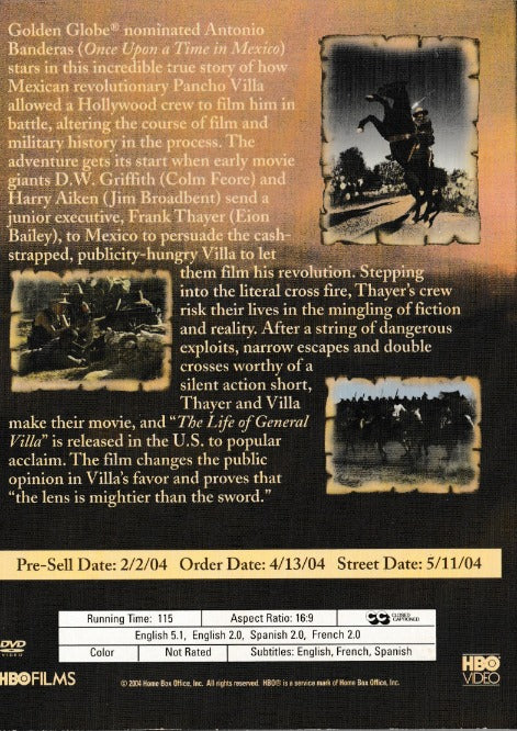 Antonio Banderas (Spy Kids, Once Upon a Time in Mexico) delivers a powerful, larger-than-life performance as the title character of this incredible true story of how Mexican Revolutionary, Pancho Villa, allowed a Hollywood crew to film him in battle, altering the course of film and military history in the process. The adventure gets its start when early movie giants D.W. Griffith (Colm Feore) and Harry Aiken (Jim Broadbent), send a junior executive, Frank Thayer (Eion Bailey) to Mexico to persuade the cash-strapped, publicity-hungry Villa to let them film his revolution. Stepping into the literal crossfire, Thayer's crew risks their lives in the mingling of fiction and reality. After a string of dangerous exploits, narrow escapes and double-crosses worthy of a silent action short, Thayer and Villa make their movie, and "The Life of General Villa" is released in the U.S. to popular acclaim. The film changes the public opinion in Villa's favor and proves that "the lens is mightier than the sword."