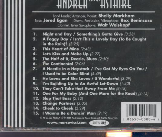 Andrea Marcovicci is a renowned American vocalist and cabaret artist who interprets classic songs from the Great American Songbook. On Andrea Sings Astaire she delivers intimate, swinging interpretations of songs associated with Fred Astaire. The arrangements are led by band leader, arranger and pianist Shelly Markham, and the set features a small jazz ensemble that supports her warm, expressive delivery. The album blends vocal jazz, traditional pop and Broadway-era standards in a tasteful, sophisticated style.