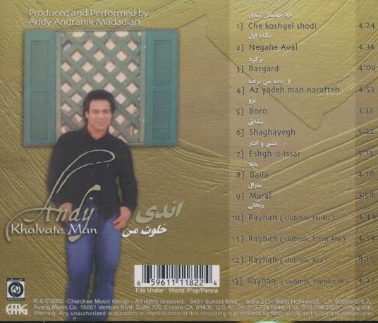 Andy (Andranik Madadian) is an Iranian-Armenian pop singer known for blending Persian melodic traditions with contemporary pop production. This album, Khalvate Man, showcases his emotive vocal delivery and danceable pop arrangements. The record includes ballads and upbeat club mixes, reflecting Andy's versatility as both a performer and producer. The songs are performed primarily in Persian and target audiences of Persian pop and world music.