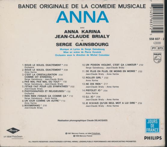 Musique et Lyrics de Serge Gainsbourg. Mise en scène: Pierre Koralnik. Orchestre sous la direction de Michel Colombier. Réalisation phonographique: Claude Dejacques. Labels: Philips, Mercury France (un label PolyGram). Jours de France logo on packaging. Copyright credits on back: © 1967 Mercury France; © 1998 Mercury France.