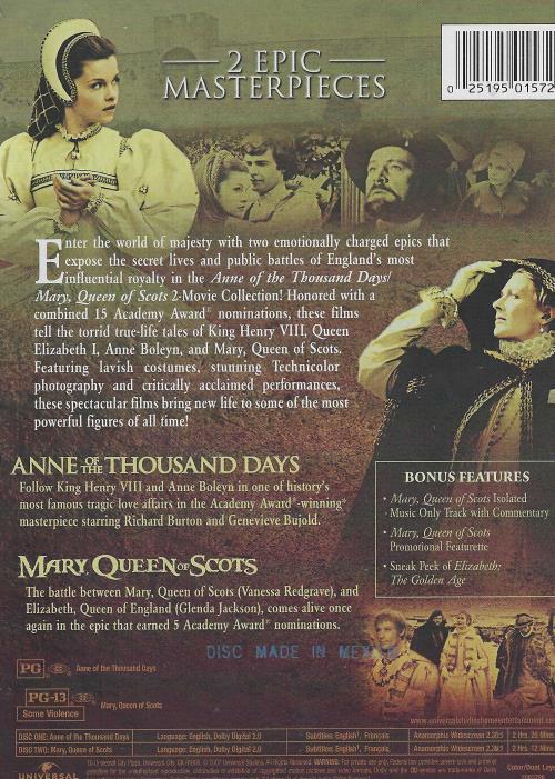 Enter the world of majesty with two emotionally charged epics that expose the secret lives and public battles of England's most influential royalty in the Anne of the Thousand Days / Mary, Queen of Scots 2-Movie Collection! Honored with a combined 15 Academy Award nominations, these films tell the torrid true-life tales of King Henry VIII, Queen Elizabeth I, Anne Boleyn, and Mary, Queen of Scots. Featuring lavish costumes, stunning Technicolor photography and critically acclaimed performances, these spectacular films bring new life to some of the most powerful figures of all time!