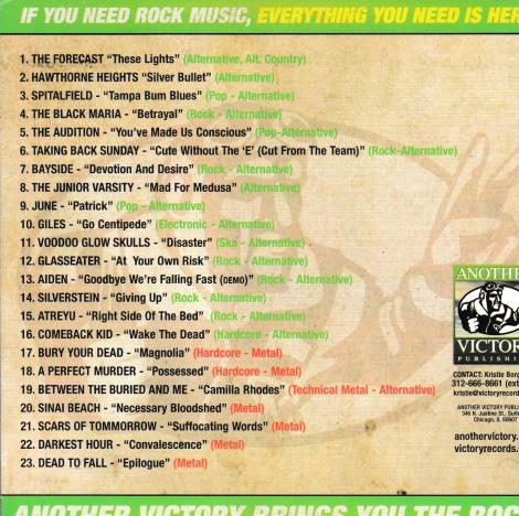 1. THE FORECAST "These Lights" 2. HAWTHORNE HEIGHTS "Silver Bullet" 3. SPITALFIELD - "Tampa Bum Blues" 4. THE BLACK MARIA - "Betrayal" 5. THE AUDITION - "You've Made Us Conscious" 6. TAKING BACK SUNDAY - "Cute Without The `E' (Cut From The Team)" 7. BAYSIDE - "Devotion And Desire" 8. THE JUNIOR VARSITY - "Mad For Medusa" 9. JUNE - "Patrick" 10. GILES - "Go Centipede" 11. VOODOO GLOW SKULLS - "Disaster" 12. GLASSEATER - "At Your Own Risk" 13. AIDEN - "Goodbye We're Falling Fast (DEMO)" 14. SILVERSTEIN - "Giving Up" 15. ATREYU - "Right Side Of The Bed" 16. COMEBACK KID - "Wake The Dead" 17. BURY YOUR DEAD - "Magnolia" lcore - Metal) 18. A PERFECT MURDER - "Possessed" 'n--nr— k4 e ta I ) 19. BETWEEN THE BURIED AND ME - "Camilla Rhodes" ;Technical Metal - Alternative) 20. SINAI BEACH - "Necessary Bloodshed" 21. SCARS OF TOMMORROW - "Suffocating Words" la' 22. DARKEST HOUR - "Convalescence" 23. DEAD TO FALL - "Epilogue"