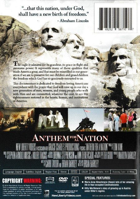 Anthem For a Nation, a documentary dedicated to freedom-loving Americans, aims to evoke the qualities that made America great. It calls for the restoration of righteousness in the hearts, homes, and institutions of America. The DVD comes with special features such as personal stories and brings forth the theme of relighting the torch of America's liberty.