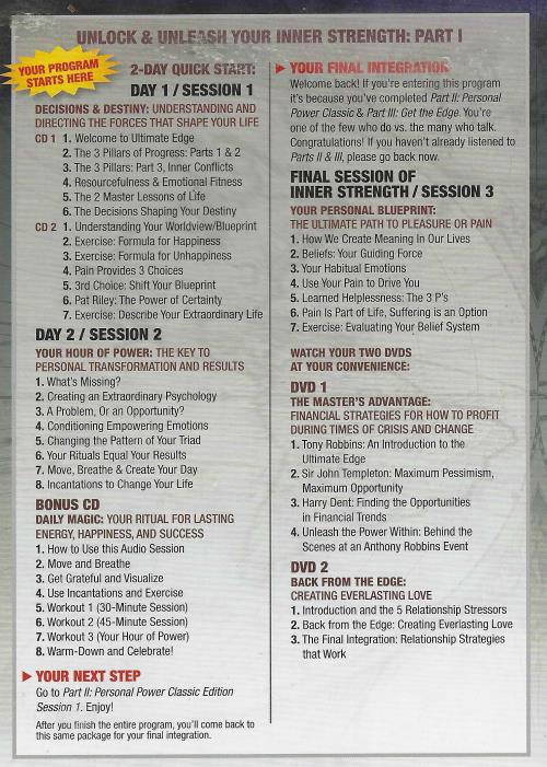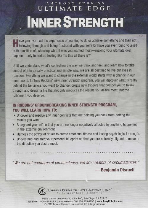 ANTHONY ROBBINS ULTIMATE EDGE-INNER STRENGTH® Have you ever had the experience of wanting to do or achieve something and then not following through and being frustrated with yourself? Or have you ever found yourself in the position of achieving what it was you wanted most—making your ultimate goal happen—only to end up feeling like "Is this all there is?" Until we understand what's controlling the way we think and feel, and leam how to take control of it in a really practical and simple way, we are all destined to live our lives in reaction. Everything we want to change in the external world starts with a change in our inner world. In Tony Robbins' new Inner Strength program, you will discover what is really behind the behaviors you want to change, create new triggers that compel you to follow through and design a life that not only produces the results you desire most, but the fulfillment you deserve.