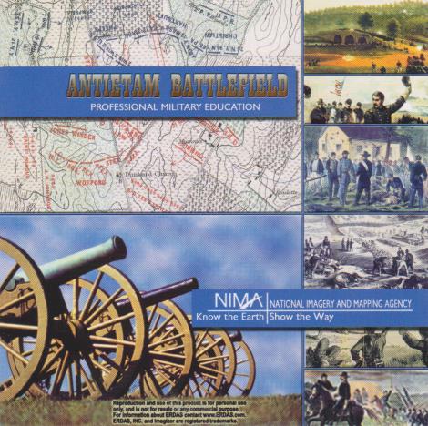 Antietam CD Photo Map NIMA developed this product to demonstrate the utility of data in digital format to our Military customers. The Battle of Antietam National Battlefield preserves the site where the first Confeder-ate invasion of the North occurred. The battle, which was fought September 17, 1862, claimed more than 23,000 men killed, wounded, or missing. The Battle of Antietam (sometimes referred to as the Battle of Sharpsburg) led to President Lincoln issuing the Emancipation Proclamation on 22 September, 1862. The maps contained on this CD show the Union and Confederate unit positions and movements. Two viewers are included: ERDAS Imagizer® will show an orientation map and corresponding imagery of the area; MR SID® Geoviewer will display one map or image at a time.