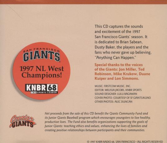 This CD captures the sounds and excitement of the 1997 San Francisco Giants' season. It is dedicated to Brian Sabean, Dusty Baker, the players, and the fans who never gave up believing, "Anything Can Happen."