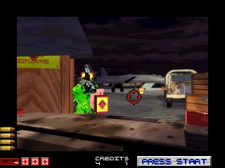 The PC port of the arcade game Area 51 is a 2D shooter in which mutants have run rampant through Area 51, the clandestine government facility where UFOs are secretly kept and it's up to the player to put this uprising down. Originally meant for use with a light gun, players use the mouse or keyboard on the PC to control a target. By clicking when the cross hairs are over the target, players fire their weapon at the targeted enemy or item and periodically need to reload by clicking off the screen. While all of this is going on, digitized 2D enemies fire rockets, missiles, bullets and stranger things at the player, hoping to deplete his or her energy until they perish.