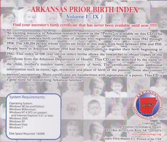 Arkansas Genealogical Society: Arkansas Prior Birth Index Vol I-IX PC CD family