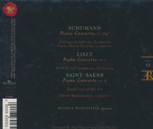 Arthur Rubinstein was a celebrated pianist best known for his interpretations of the Romantic piano repertoire. This release brings together Rubinstein with major orchestras for three landmark concertos by Schumann, Liszt, and Saint-Saëns. The performances feature distinguished conductors and orchestras, including Carlo Maria Giulini with the Chicago Symphony Orchestra and Alfred Wallenstein with the Symphony of the Air. The recordings span the 1950s and 1960s and highlight Rubinstein’s lyrical tone and virtuoso poise.
