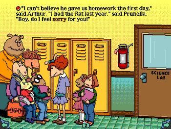 Arthur's new teacher, Mr. Ratburn, gives them a special spelling test in the first week of school to determine who will enter the September Spelling Bee. Only two students manage to spell all the words correctly, and Arthur is one of them. He feels nervous about the upcoming test, and studies very hard. His parents help, and even D.W. does her part. Finally, it's the day of the School-wide Spelling Bee and an older student, who won last year, is confident she will win, so Arthur thinks he'll lose. At the last minute, it comes down to Arthur and the older student. But who wins? You'll have to play the CD-Rom to find out. Click tiny animations on each page of the story for character interaction.