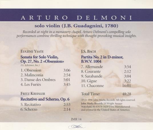 Recorded at night in a monastery chapel, Arturo Delmoni's compelling solo performances combine thrilling technique with thought-provoking musical insights.